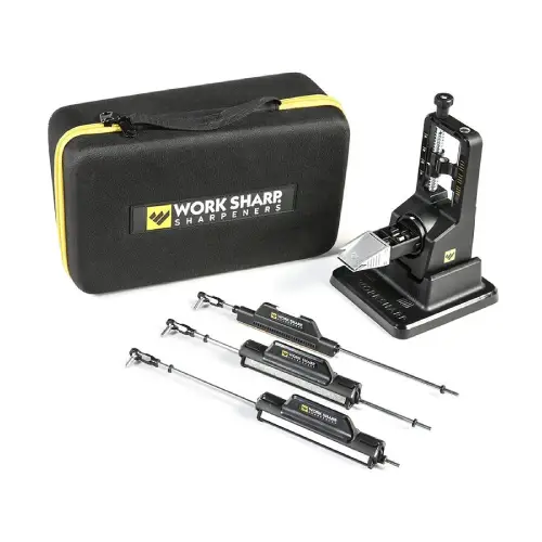 Innovative V-Block Clamp design quickly and safely secures the knife when sharpening. Carry case and Tri-Brasive storage rack keep the abrasives and the sharpener organized and ready for use.
