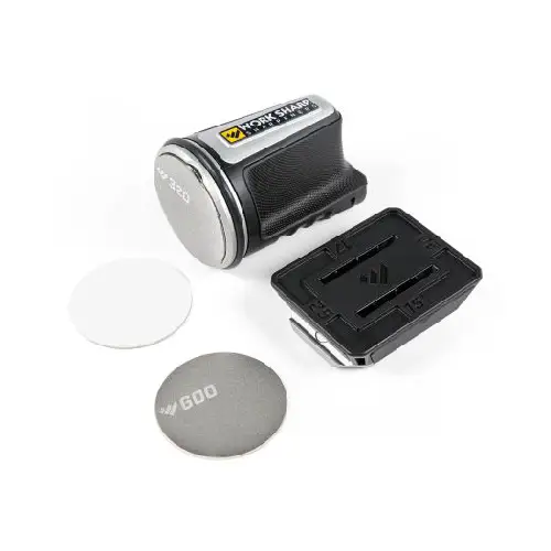 - Three quick-change abrasive discs: 320-grit medium diamond, 600-grit fine diamond, ultra-fine ceramic hone